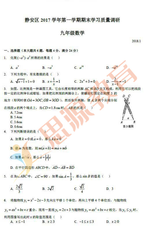 2018静安区上海一??伎?,思源教育小编第一时间整理了数学考卷的真题和答案解析,分享给大家。其他区的同学们可以参考静安区的考点和难度,最之后的冲刺复习。